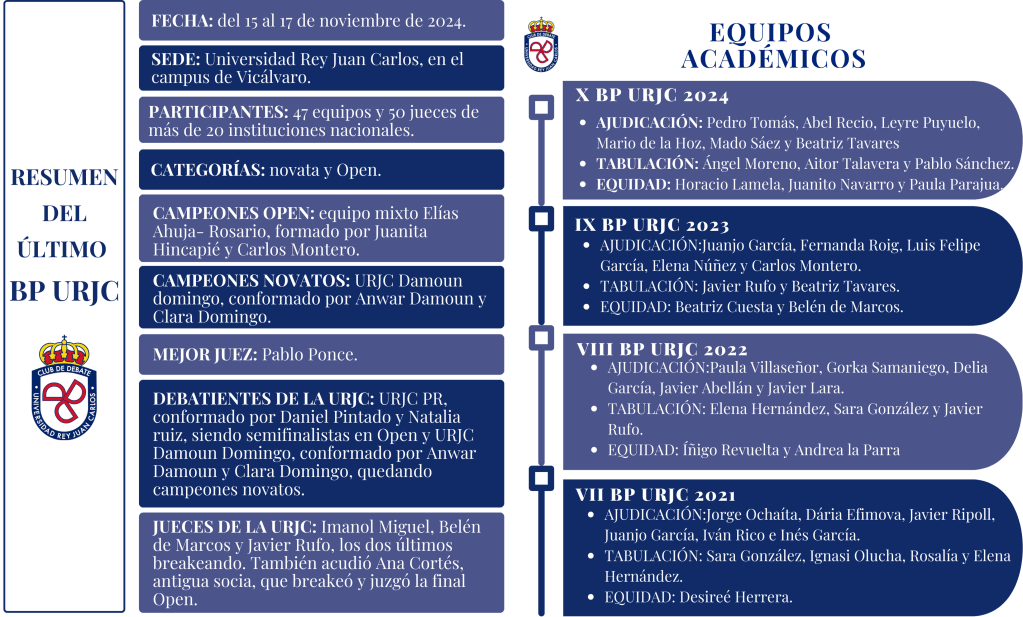 El torneo BP URJC es uno de los eventos más destacados a nivel nacional en el ámbito del debate, no solo por su longevidad (es el que más ediciones ha celebrado en España), sino también por el prestigio que ha consolidado a lo largo del tiempo. Esta reputación se debe a varios factores: la presencia de equipos académicos de alto nivel dentro del circuito, el atractivo premio de una plaza en el prestigioso torneo Round Robin hispanohablante y la amplia experiencia organizativa que lo respalda.